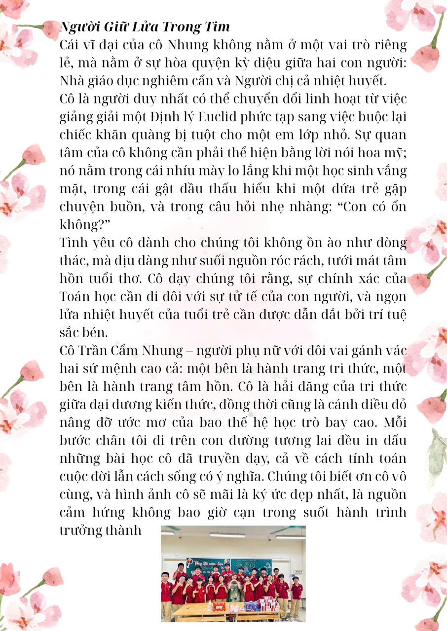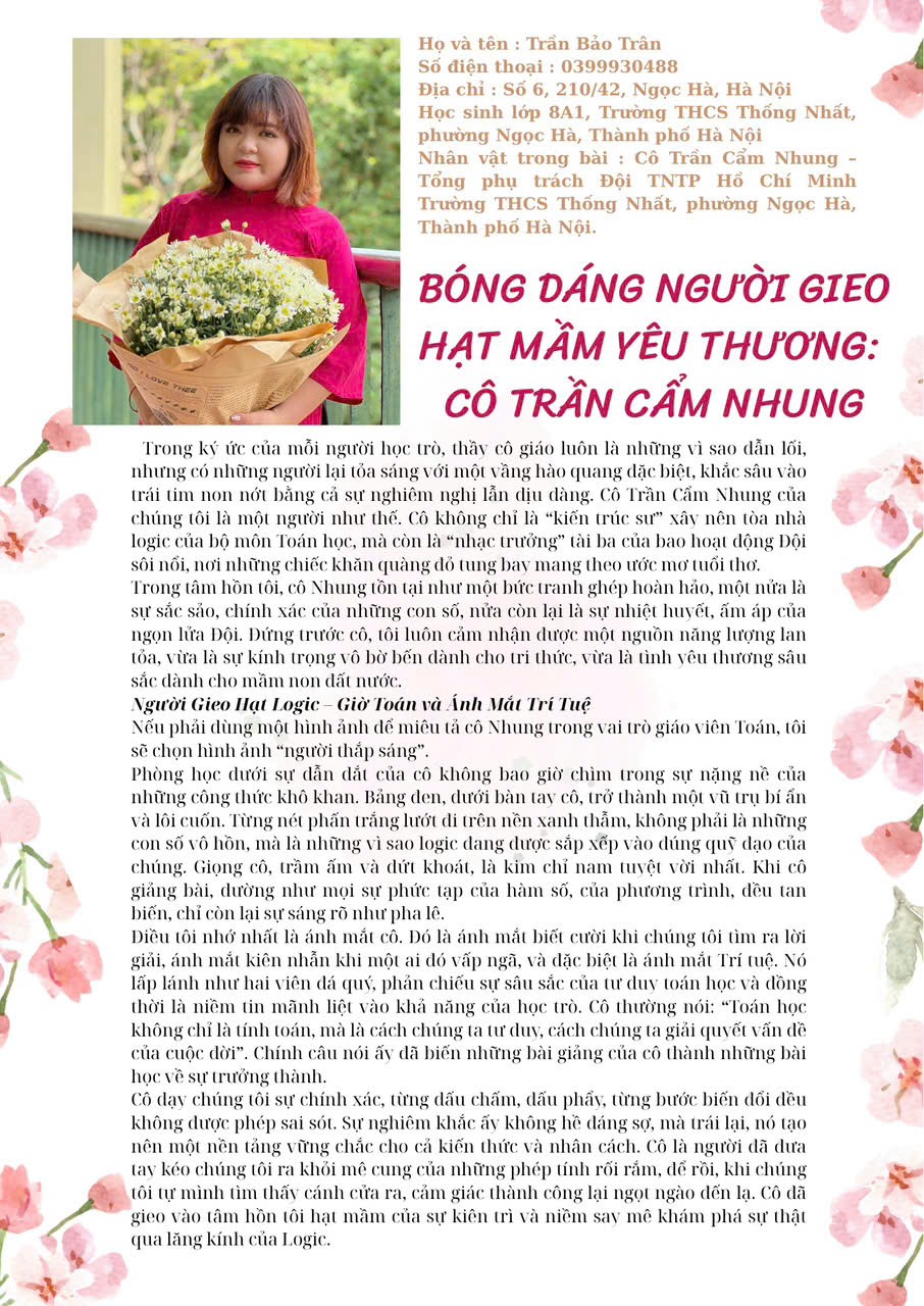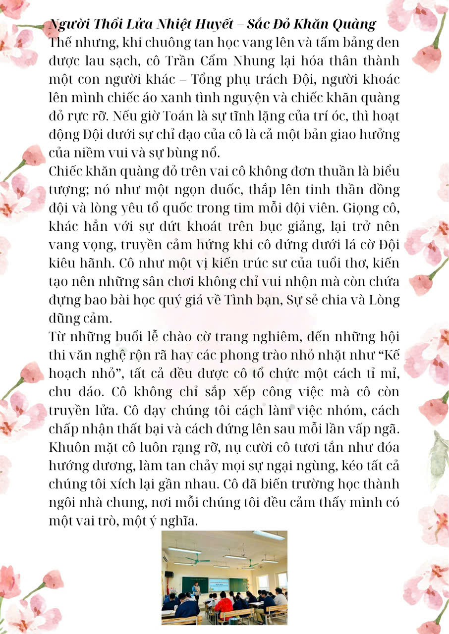 Nhà trường trân trọng giới thiệu tác phẩm của các em – những câu chuyện đẹp, mộc mạc, ghi lại kỷ niệm đáng nhớ về thầy cô và mái trường thân yêu. Dưới đây là bài viết của học sinh Trần Bảo Trân - lớp 8A1 về cô giáo Trần Cẩm Nhung – TPT Đội trường THCS Thống Nhất.