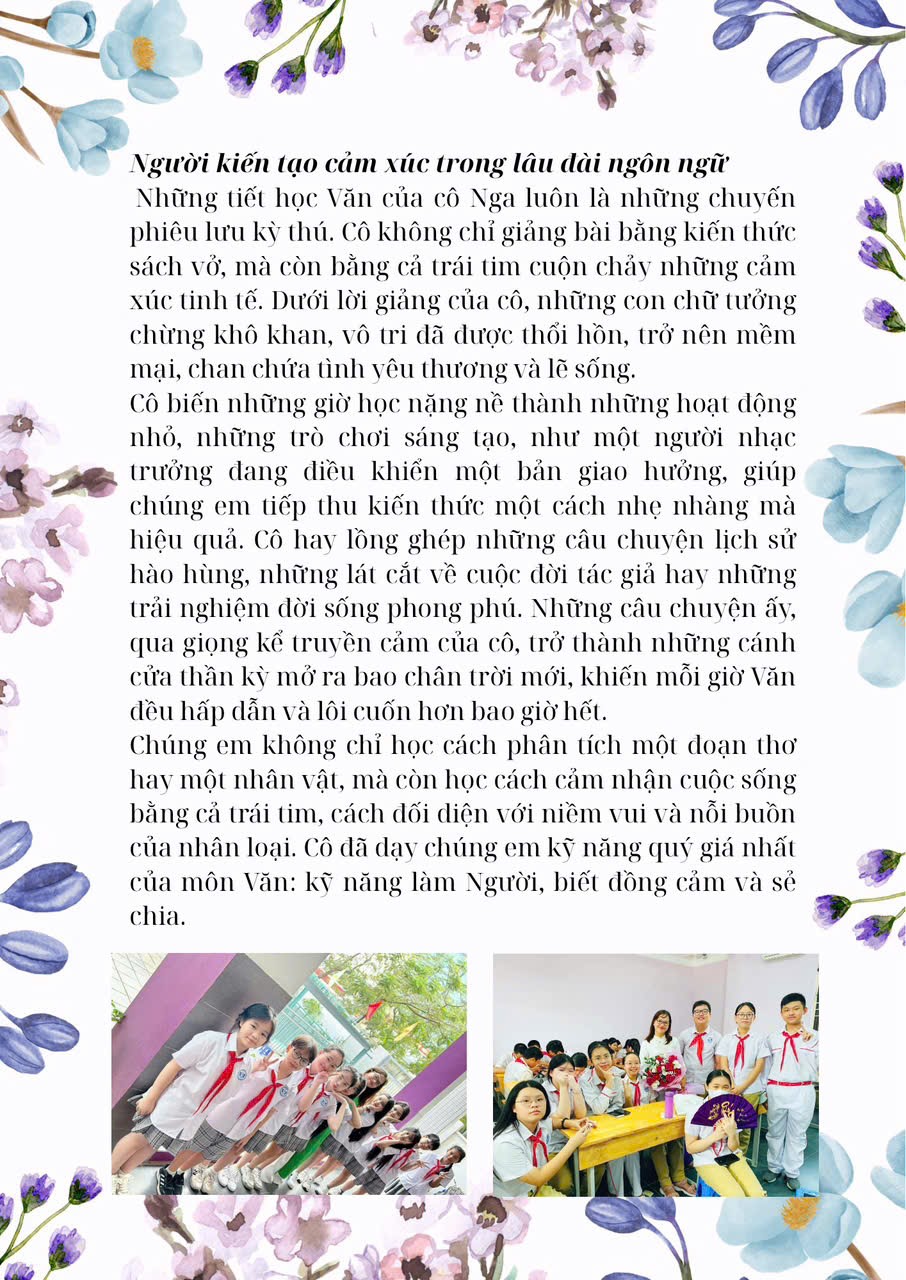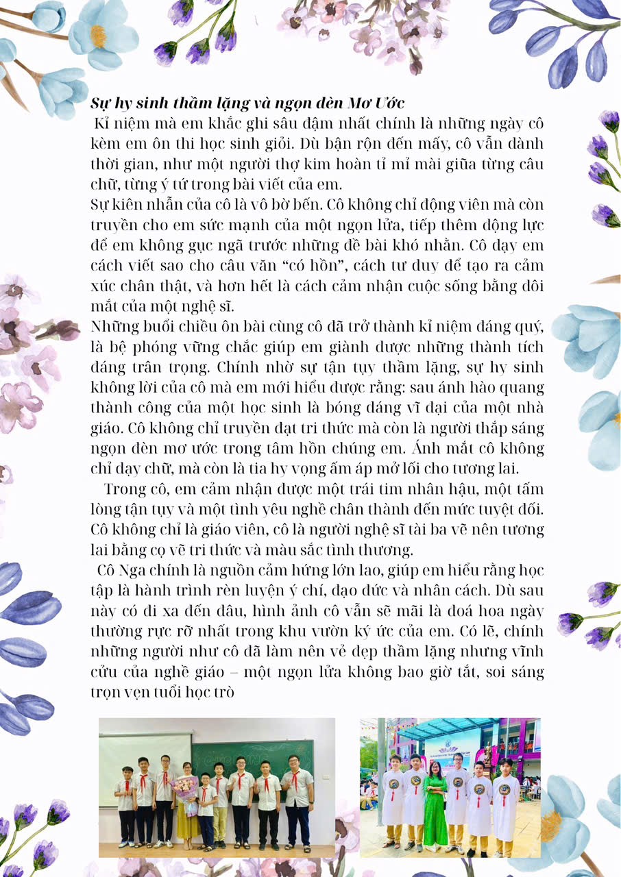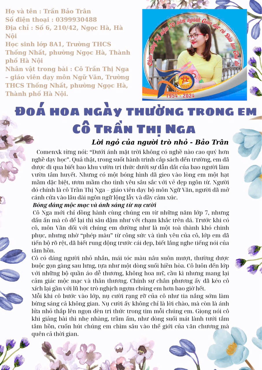 Nhà trường trân trọng giới thiệu tác phẩm của các em – những câu chuyện đẹp, mộc mạc, ghi lại kỷ niệm đáng nhớ về thầy cô và mái trường thân yêu. Dưới đây là bài viết của học sinh Trần Bảo Trân - lớp 8A1 về cô giáo Trần Thị Nga – Giáo viên môn Ngữ văn trường THCS Thống Nhất.