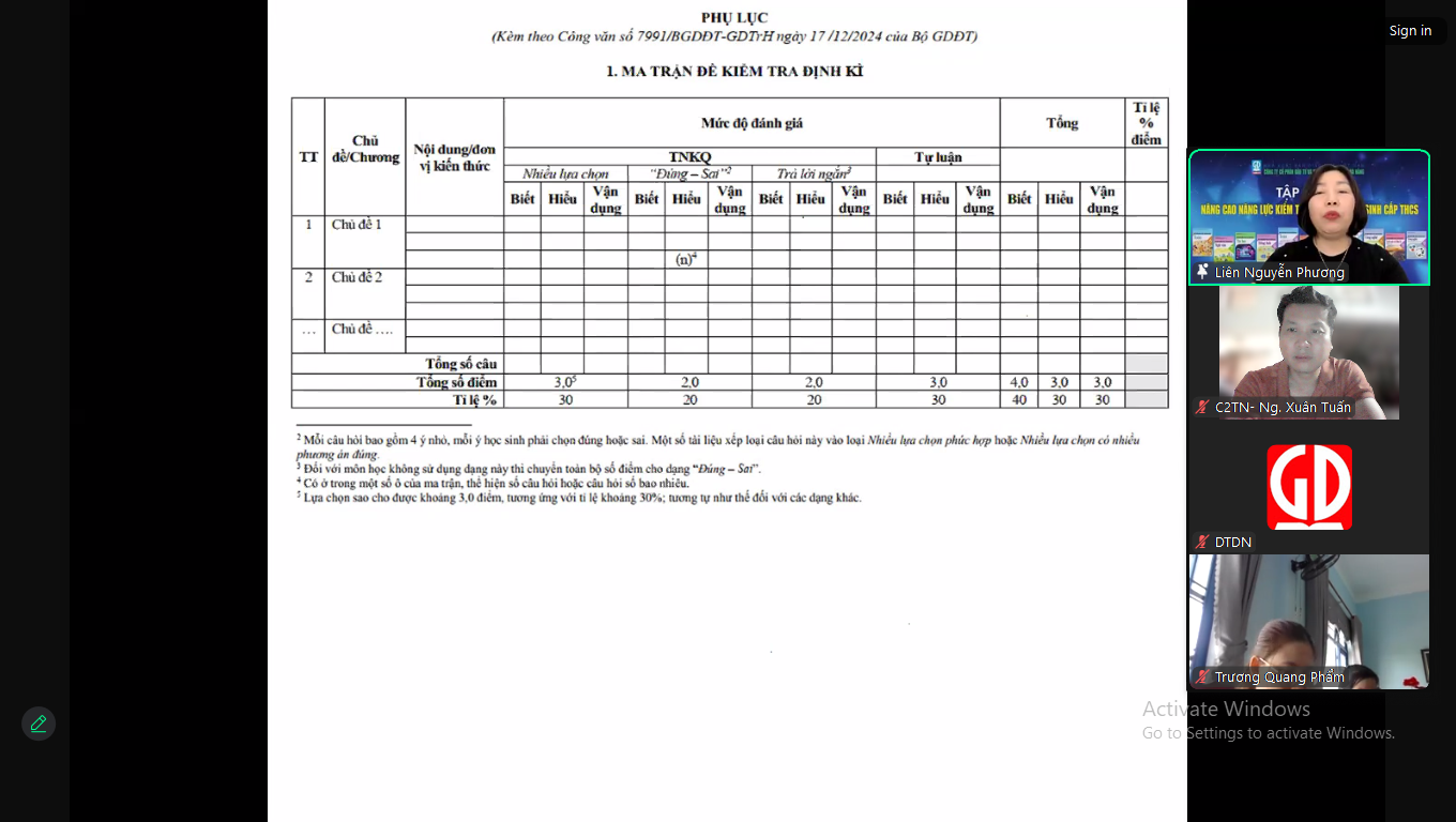 Buổi tập huấn tập trung vào những nội dung trọng tâm: Một số vấn đề chung về kiểm tra, đánh giá theo Chương trình Giáo dục phổ thông 2018; Phân tích cấu trúc ma trận, bản đặc tả đề kiểm tra định kì; Thực hành xây dựng ma trận và đề kiểm tra định kì theo định hướng phát triển năng lực.