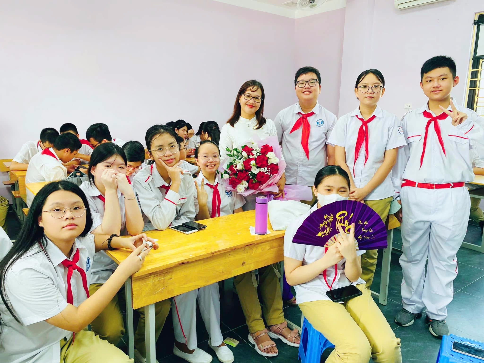 Bạn Đặng Gia Bảo (đứng cạnh cô giáo chủ nhiệm Trần Thị Nga) cùng một số học sinh lớp 9A1.