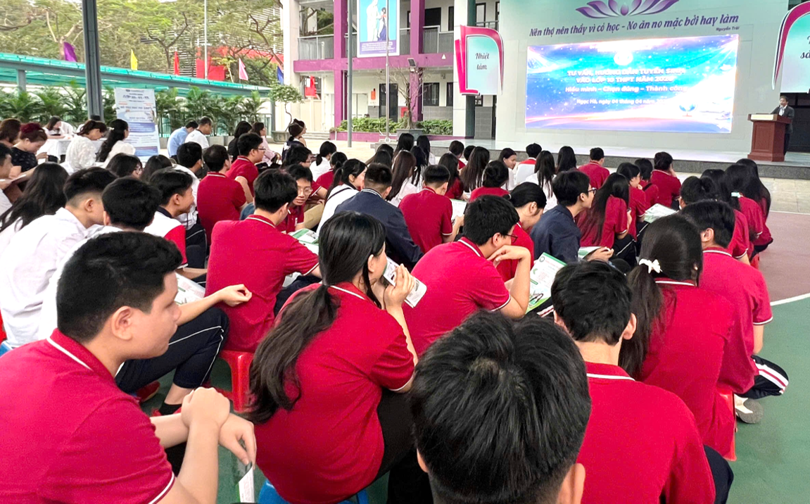 Học sinh được lắng nghe đại diện các đơn vị trường THPT hướng dẫn tuyển sinh.