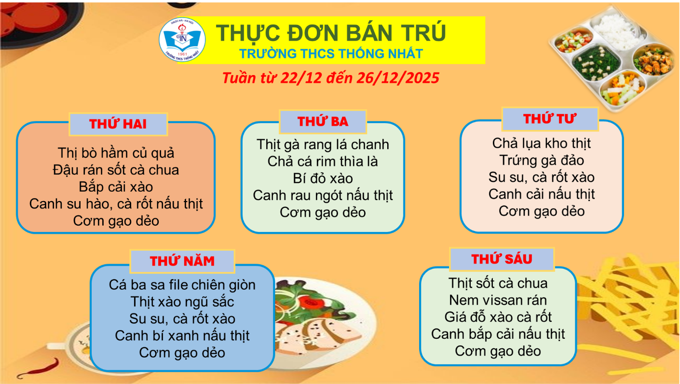 Thực đơn bán trú tuần từ 22/12 -26/12/2025