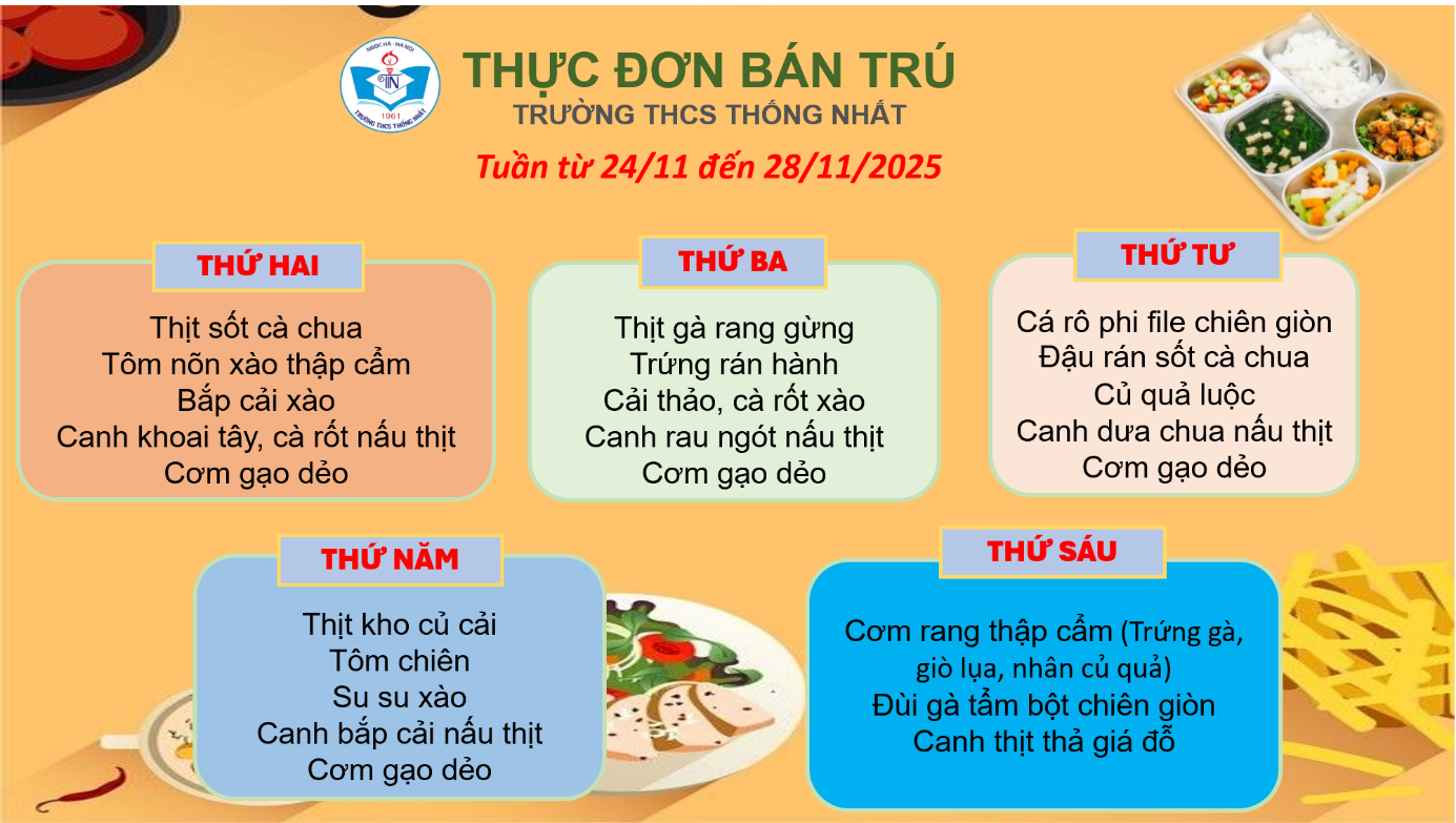 🌷Nhà trường xin gửi tới các bậc phụ huynh và các con học sinh Thực đơn tuần từ 24/11 - 28/11/2025