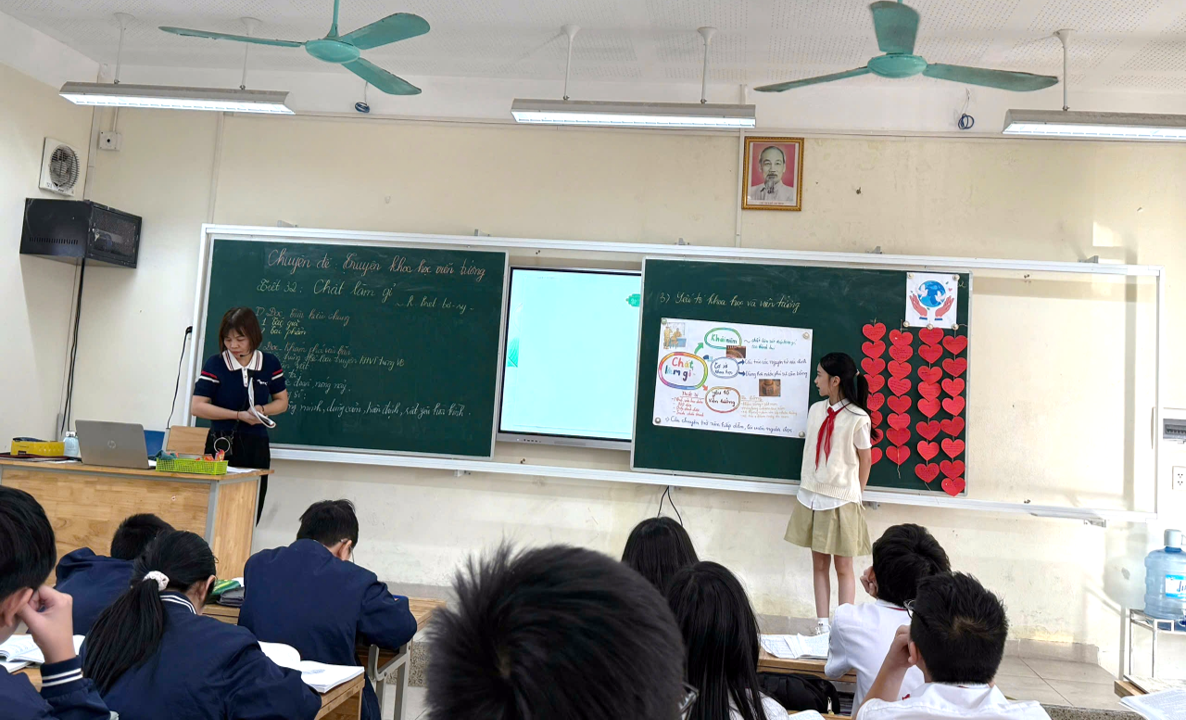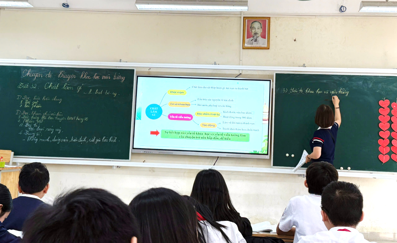 Trong suốt tiết học, cô Liên dẫn dắt các em học sinh một cách nhẹ nhàng, giàu hình ảnh minh họa, giúp các em nhanh chóng nắm bắt được nội dung, ý nghĩa và các yếu tố đặc trưng của truyện khoa học viễn tưởng. Qua việc kết hợp thảo luận nhóm, hỏi đáp và phân tích từng chi tiết trong văn bản, học sinh được khuyến khích phát biểu ý kiến, đưa ra dự đoán và tự rút ra nhận xét về tính khoa học, sáng tạo của truyện. Không khí lớp học diễn ra sôi nổi, thân thiện, tạo điều kiện cho các em chủ động tham gia và trao đổi học thuật.