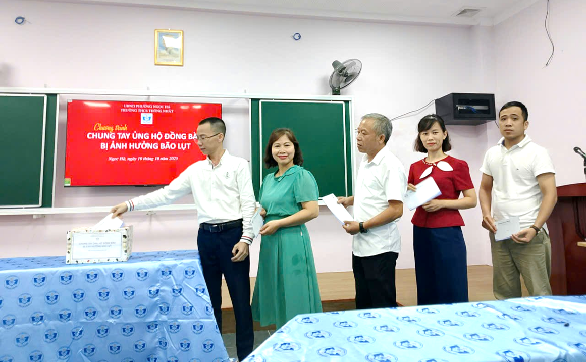 Đại diện Ban giám hiệu và giáo viên nhà trường chung tay ủng hộ đồng bào bị ảnh hưởng bão lụt.