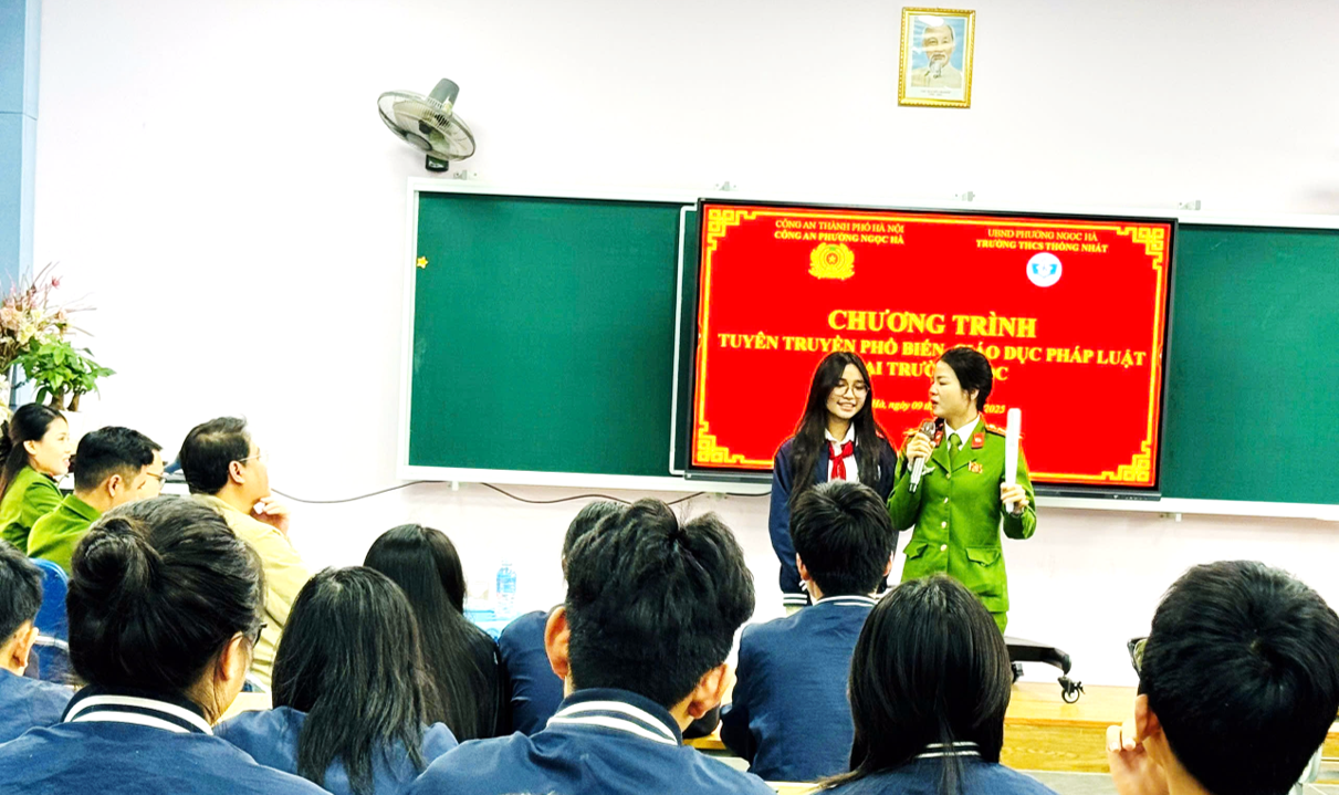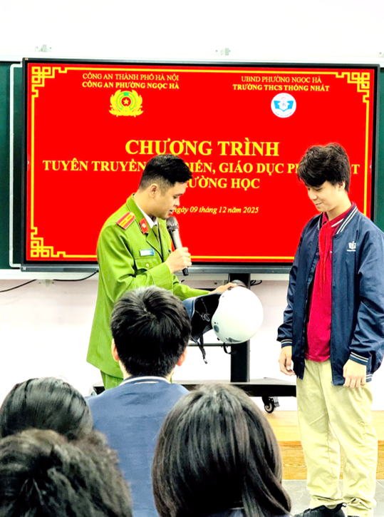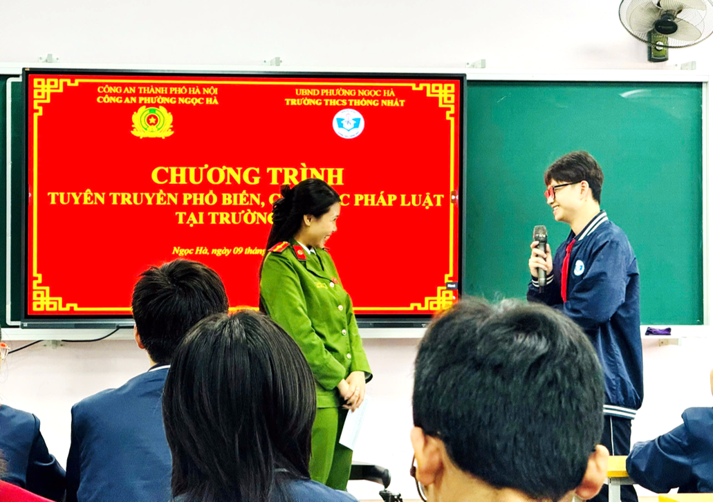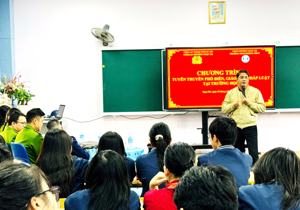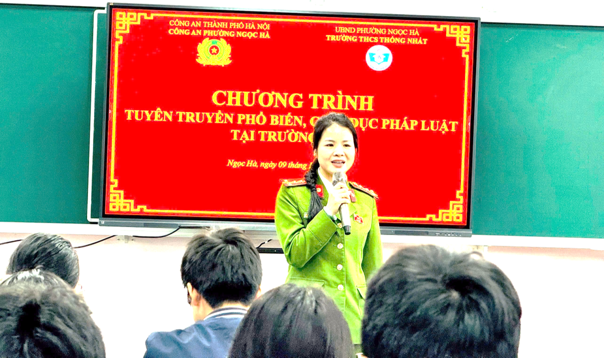 Đồng chí cán bộ công an phường Ngọc Hà tuyên truyên phổ biến pháp luật cho học sinh trường THCS Thống Nhất.