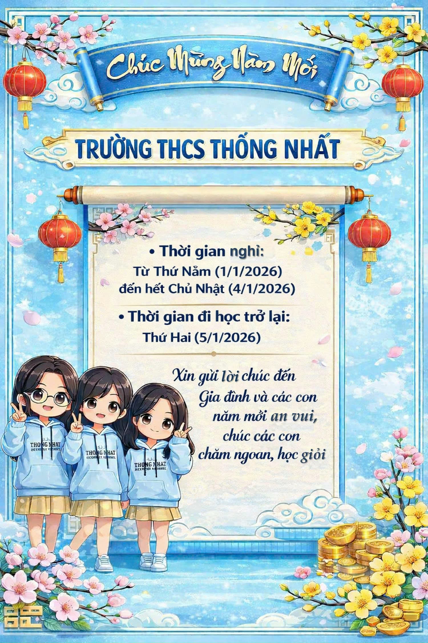 Nhân dịp năm mới, Trường THCS Thống Nhất kính chúc quý phụ huynh, cán bộ, giáo viên và các em học sinh một năm mới an khang, mạnh khỏe, hạnh phúc và thành công