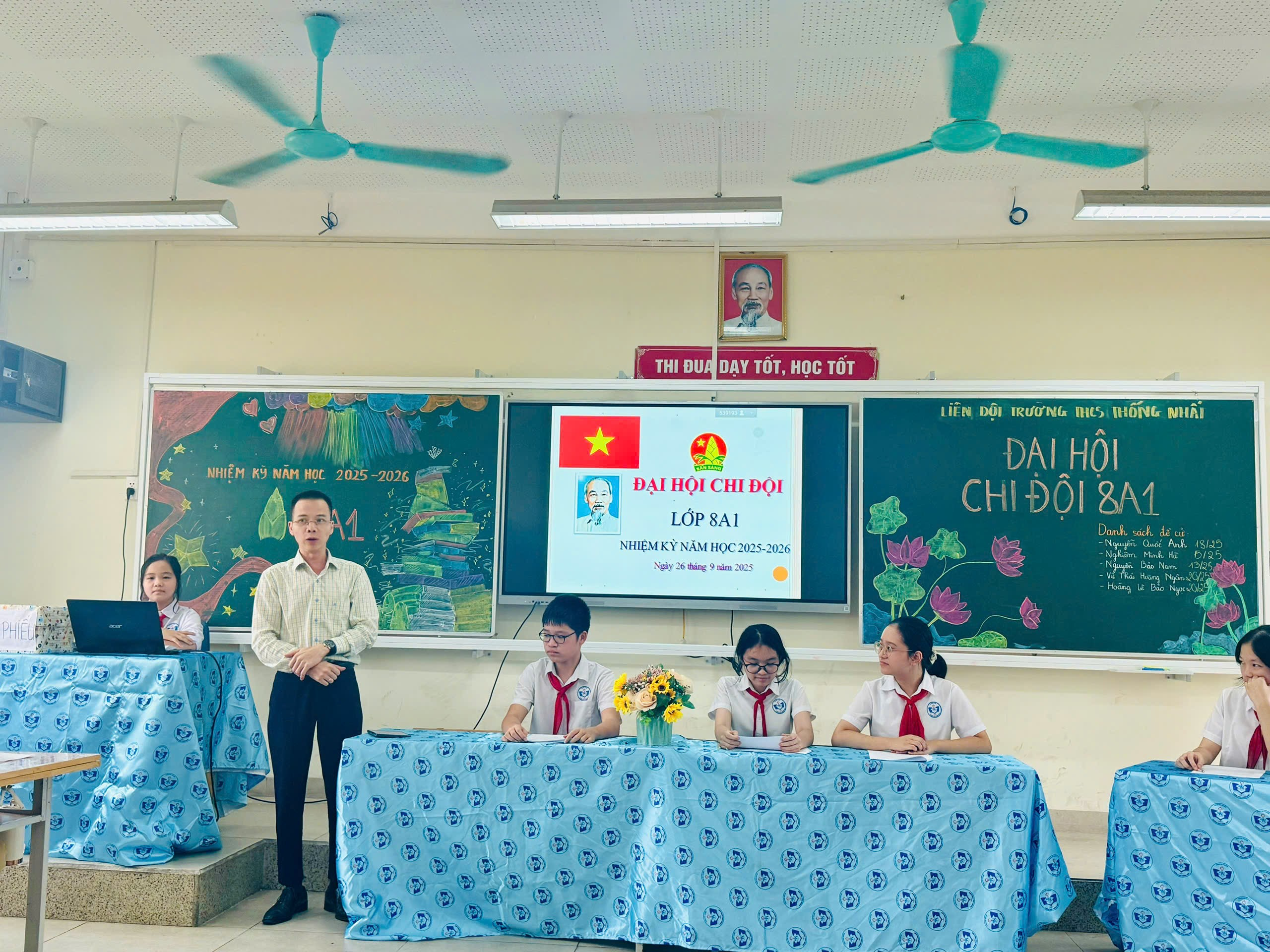 Đại hội vinh dự đón thầy Giang Minh Hưởng – Phó Hiệu trưởng nhà trường, cô Trần Cẩm Nhung – Tổng phụ trách Đội, thầy Lại Phú Quân – Giáo viên chủ nhiệm, phụ trách chi đội, cùng đại diện các chi đội trong Liên đội và toàn thể đội viên lớp 8A1.