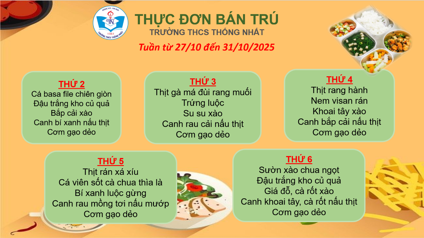 Thực đơn bán trú tuần từ 27/10-31/10/2025