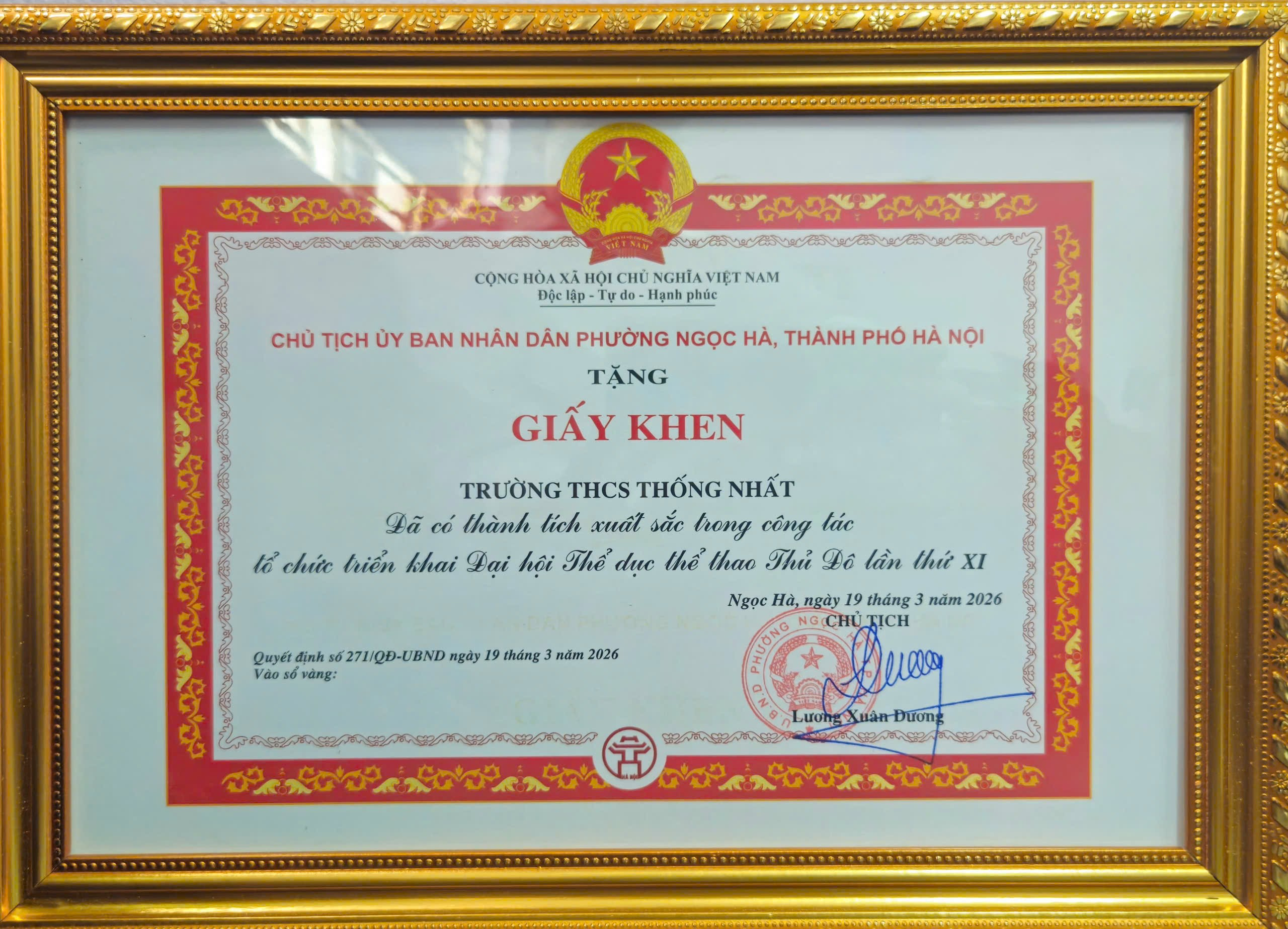 Ngày 26/3/2026, Trường THCS Thống Nhất vinh dự được Chủ tịch Ủy ban nhân dân phường Ngọc Hà, thành phố Hà Nội trao tặng Giấy khen vì đã có thành tích xuất sắc trong công tác tổ chức triển khai Đại hội Thể dục Thể thao Thủ Đô lần thứ XI.
