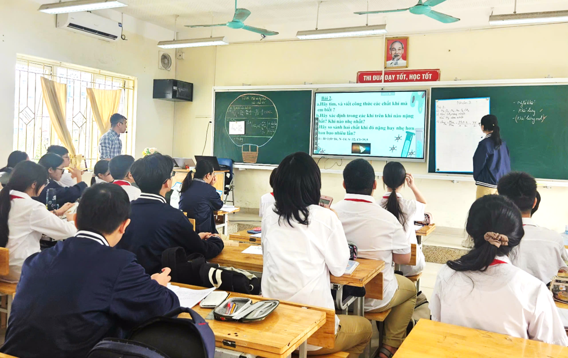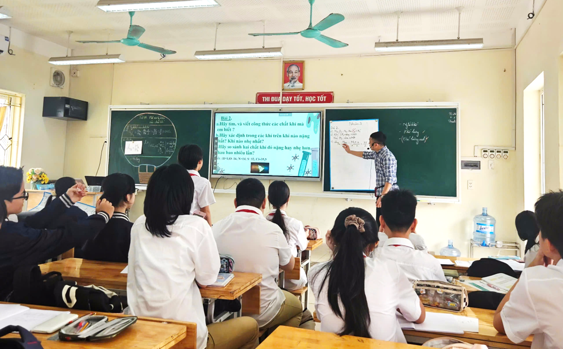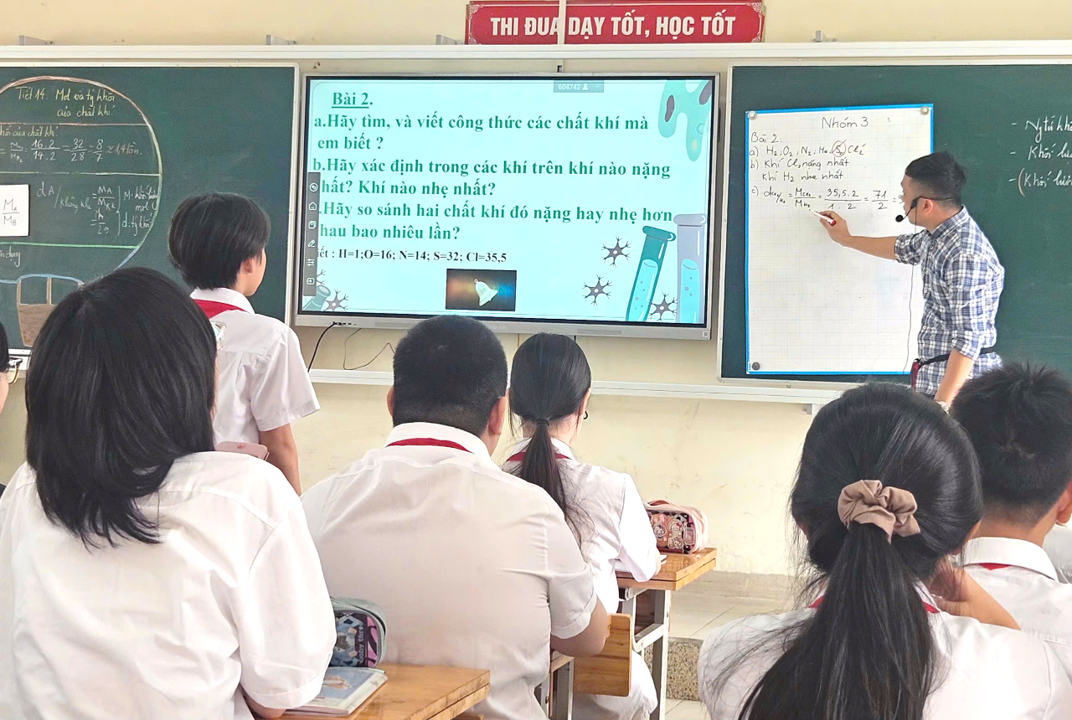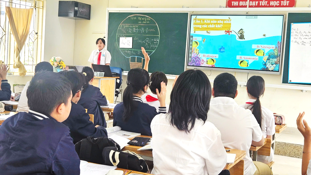 Trong tiết học, thầy giáo Lại phú Quân đã triển khai chuỗi hoạt động học đa dạng: học sinh điền bảng tính toán, xây dựng công thức, so sánh tỉ khối giữa các khí, và đặc biệt là tham gia trò chơi “Fishing Game” thú vị để củng cố kiến thức. Phương pháp chuyển giao nhiệm vụ học tập được thực hiện sinh động, rõ ràng; thầy theo dõi sát sao tiến trình học tập, phát hiện và hỗ trợ kịp thời những nhóm gặp khó khăn.